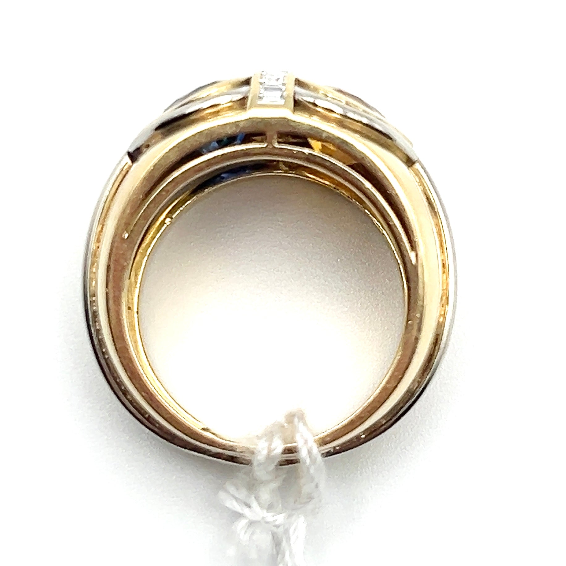 Sri Lankan (Ceylon) yellow and blue heart cut sapphires set in 18k yellow gold. Accented by eight channel set square step cut diamonds.